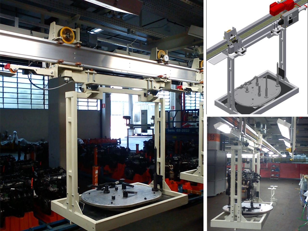 Finally, in the marriage, the suspended body is positioned on the plate containing the powertrain assembly, here the synchronism of speeds between the overhead conveyor and the roller table that contains the powertrain assembly plate takes place. At the same time the transfer speeds are synchronized (powertrain and body), the powertrain assembly plate table begins to lift until it engages the assembly with the body. At the next stations, the components are bolted to the body, then the assembly plate is uncoupled, leaving the body and powertrain together being transported by the overhead conveyor.