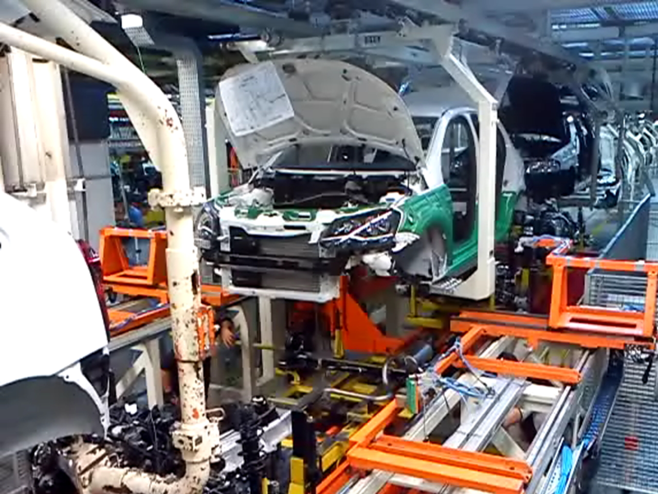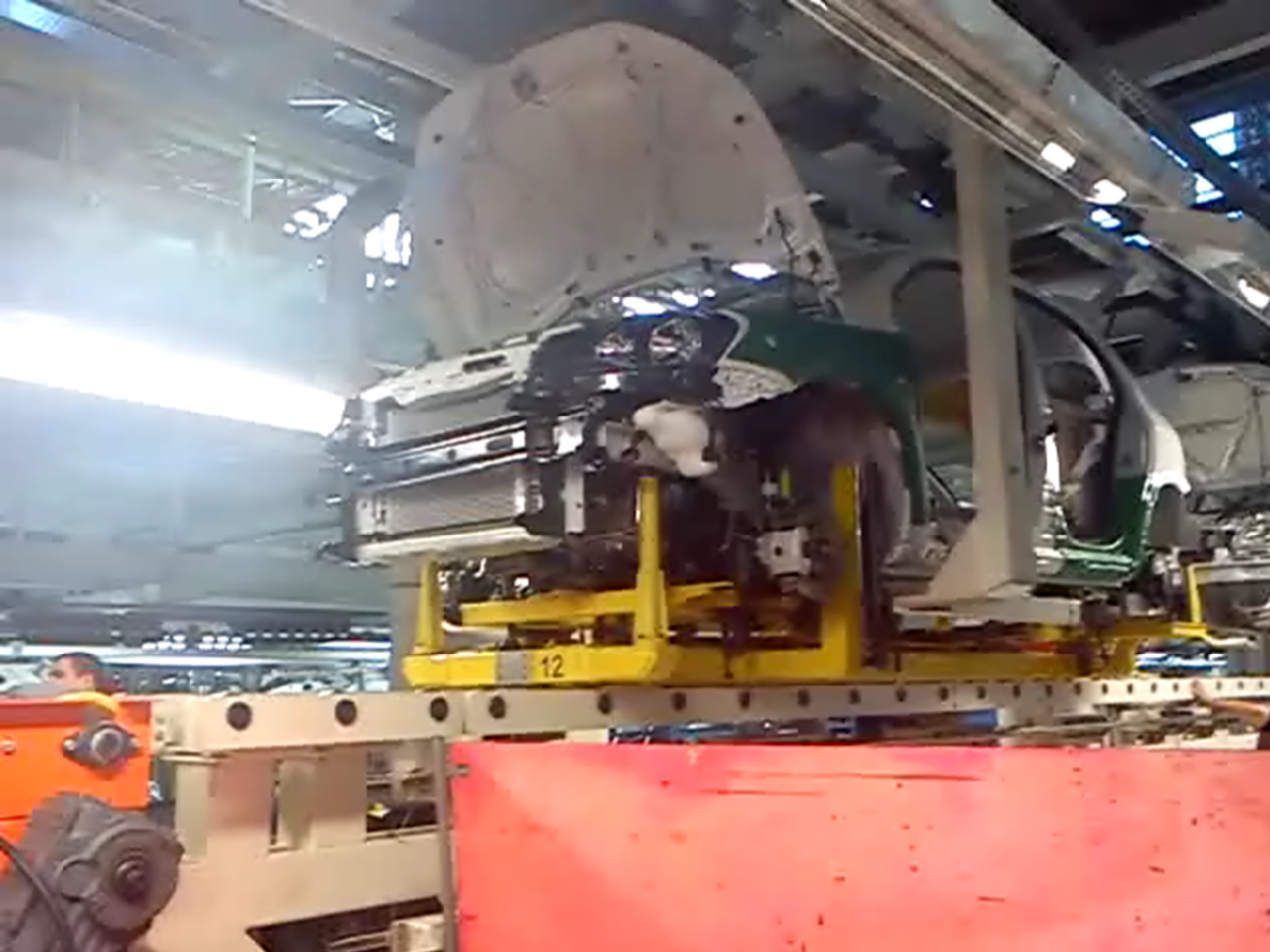 The powertrain assembly starts with the assembly of engine accessories (hoses and belts). Most of the screws are performed with automatically controlled torque. After the engine is assembled, the powertrain set is mounted on a special assembly plate, which is transported on roller tables. The plate is transported through different stations where step by step the porwertrain system is assembled. The powertrain consists of the engine, gearbox, axles, transmission, exhausts, shock absorbers, among others. The body normally comes on an overhead conveyor with its interior assembled.