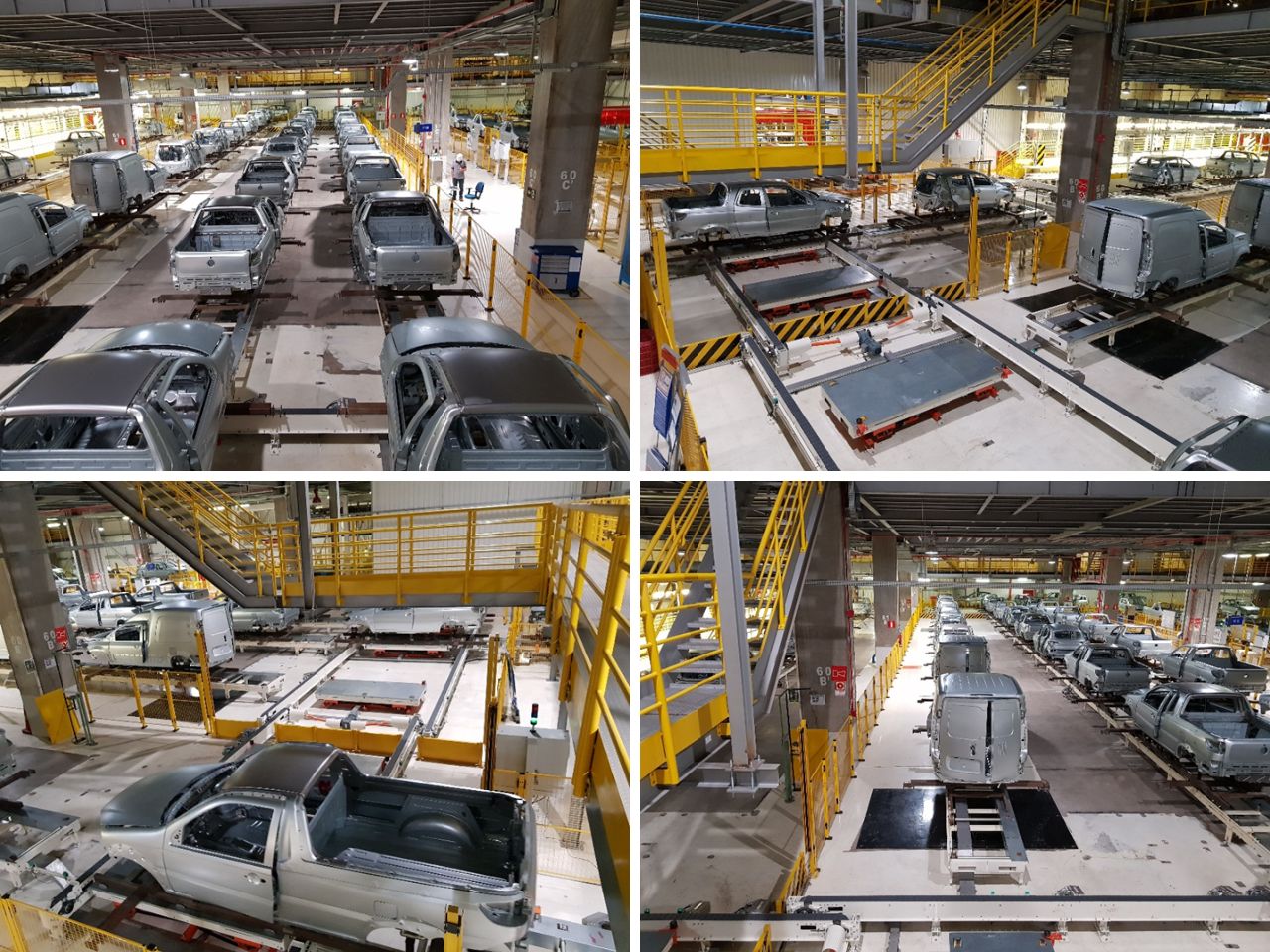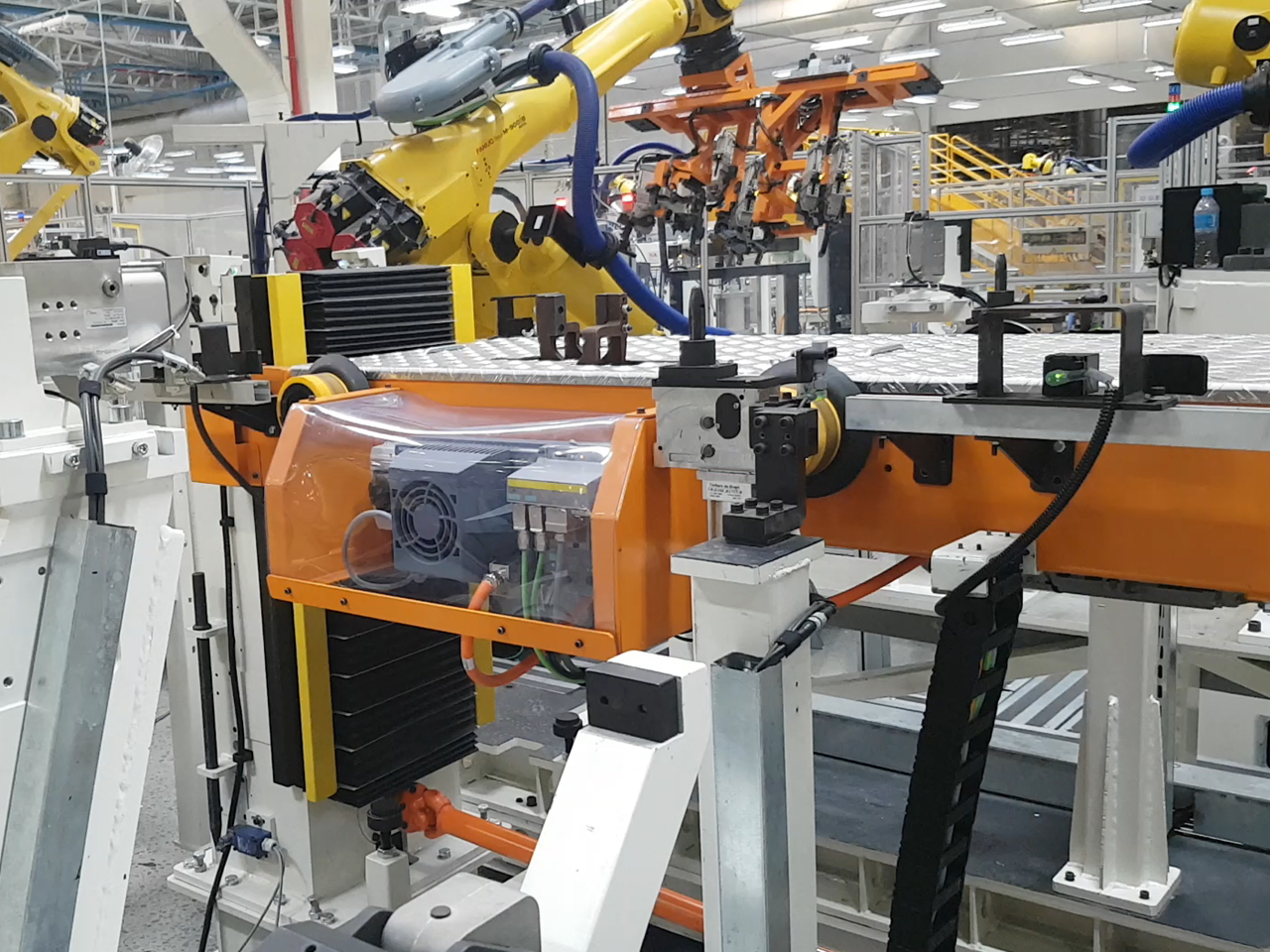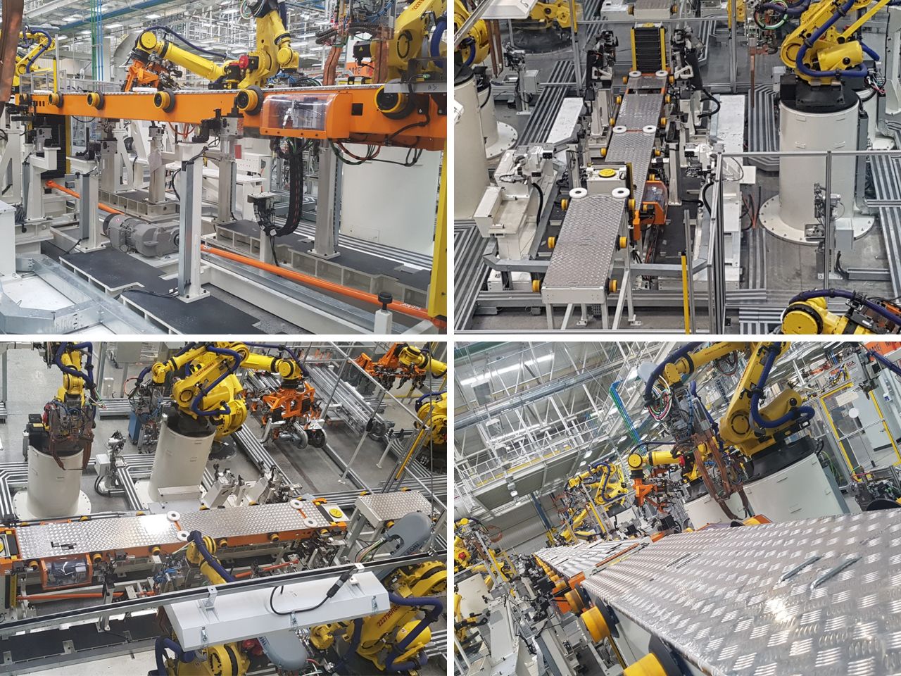 - Robot sospesi sono installati sotto un portico (completamente isolato dalle stazioni di inquadramento) per prevenire vibrazioni che affetterebbero la qualità finale del prodotto (causato dal movimento dei robot) durante la saldatura a punti