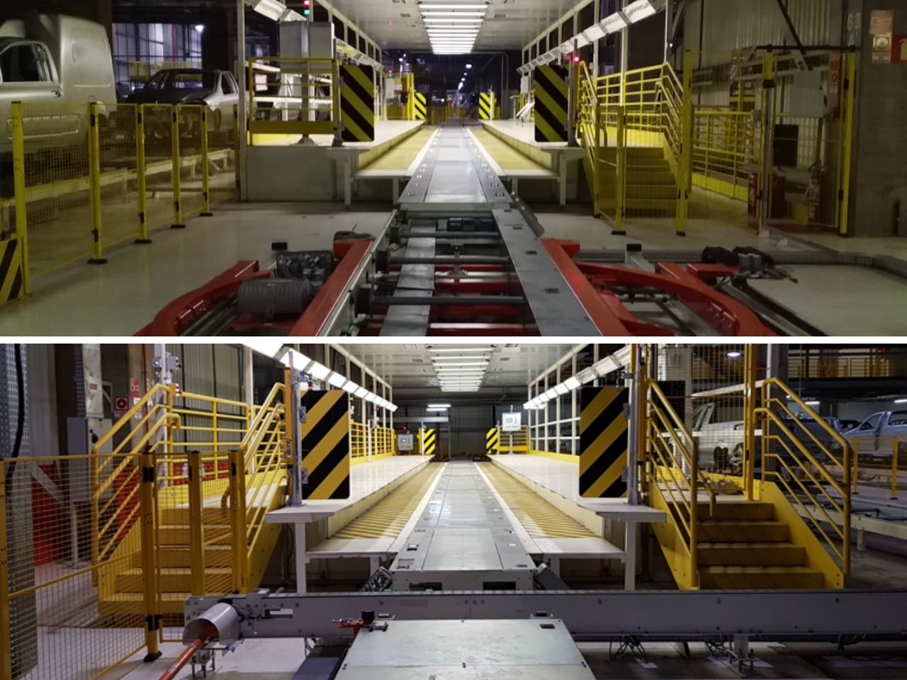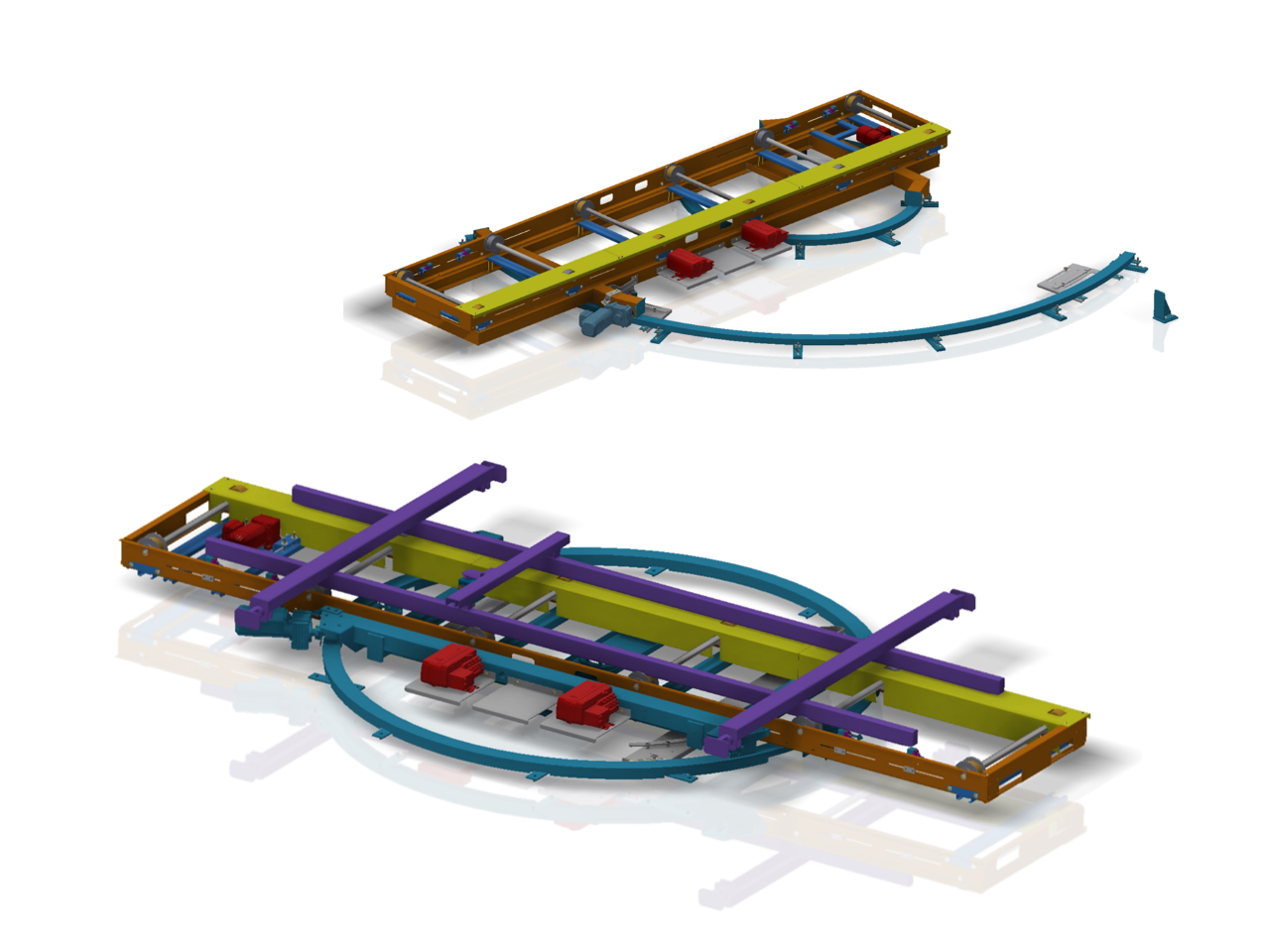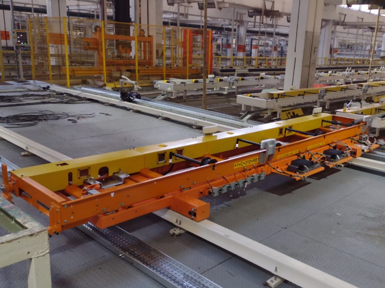 Per quanto riguarda la traslazione tra le stazioni dell’ unione skid/carrozzeria è utilizzato il concetto di tavoli con rulli con ruote guida. Le ruote guida permettono che lo spostamento sia fatto ad una velocità fino a 120m/min.