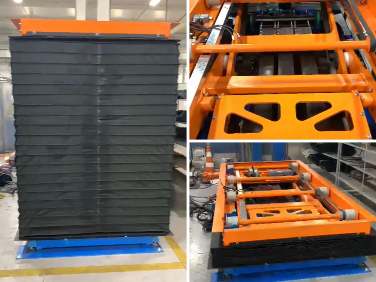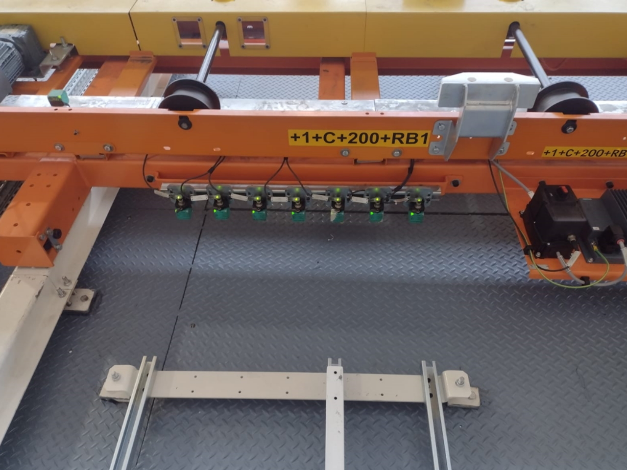 - Copertura, supporti discensori aggiustabili, sistema di posizionamento di codice a barre, registratore/lettore RFID, raccolta di energia per barriere o induzione senza contatto invece di catene di traino.